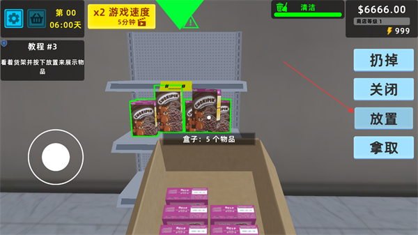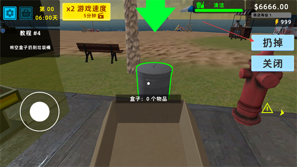 3、商品全部上架后,將空箱子拖動到垃圾桶位置,點擊扔掉按鈕丟棄空箱,節(jié)省超市空間,保持經營區(qū)域整潔。