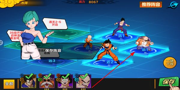 2、在布陣界面選擇角色,將其布置到對(duì)應(yīng)站位,調(diào)整陣容后點(diǎn)擊保存,確定出戰(zhàn)的戰(zhàn)斗配置。