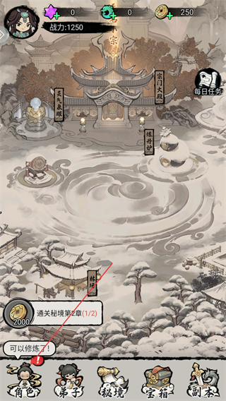 1、此為宗門主界面,可見靈氣泉眼、宗門大殿等建筑,點(diǎn)擊角色功能按鈕,進(jìn)入角色信息界面。