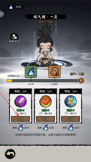 3、在境界屬性界面,點(diǎn)擊攻擊等選項(xiàng)的升級按鈕,消耗靈氣提升升級,全部10級可突破至煉氣二層。