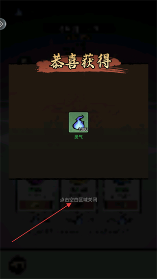4、角色等級升到10級后,將會獲得1000靈氣獎勵,按照提示點(diǎn)擊空白區(qū)域關(guān)閉該界面,領(lǐng)取獎勵用于后續(xù)修煉升級。