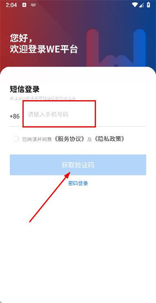 2、在手機(jī)登錄頁面填寫手機(jī)號,勾選協(xié)議后,點(diǎn)擊獲取驗(yàn)證碼。