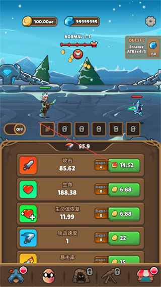 1、進(jìn)入關(guān)卡界面,找到攻擊、生命等屬性對應(yīng)的提升按鈕,消耗資源點擊這些按鈕可強化角色屬性,助力通關(guān)戰(zhàn)斗。