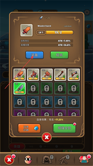 3、進(jìn)入武器界面,選中WoodenSword,點擊裝備按鈕可穿戴該武器,點擊提高按鈕能夠強化武器等級以提升屬性。