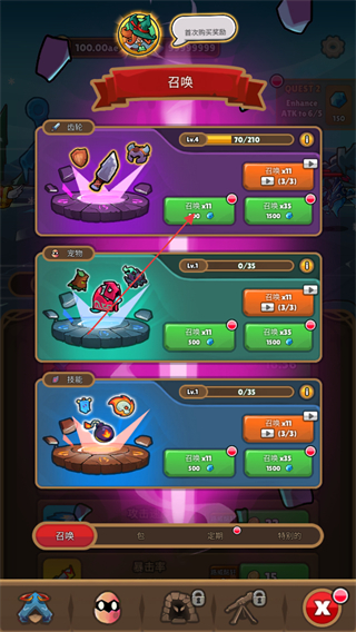 4、打開商城的召喚界面,選擇齒輪、寵物、技能任意分類,點擊對應(yīng)召喚按鈕,消耗鉆石可獲取對應(yīng)道具。