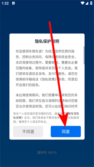 1、打開車鎮(zhèn)車源,在隱私保護說明彈窗中,點擊同意。
