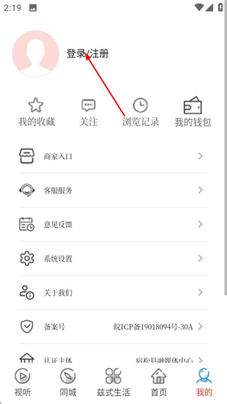 2、在個人中心頁面,點擊登錄注冊選項,進入登錄頁面。
