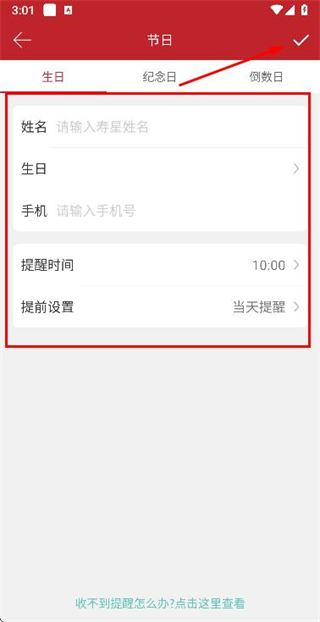 4、在生日信息填寫頁面完善內(nèi)容后,點(diǎn)擊右上角的對(duì)勾按鈕完成生日記錄的添加。