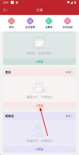 3、在記錄頁面的生日板塊點(diǎn)擊添加按鈕,進(jìn)入生日信息填寫頁面。