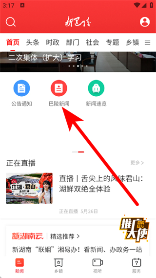 1、打開(kāi)新巴陵,在首頁(yè)點(diǎn)擊巴陵新聞,進(jìn)入新聞列表。