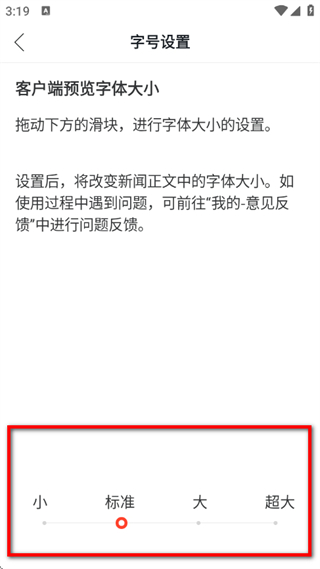 5、在字號(hào)設(shè)置頁(yè)面,拖動(dòng)滑塊選擇字號(hào),即可調(diào)整新聞?wù)淖煮w大小。
