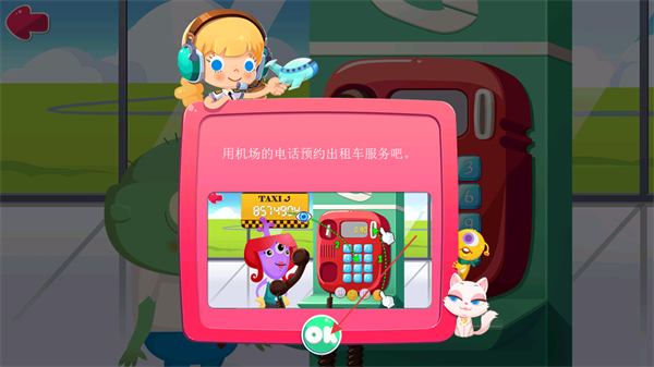 1、這是預(yù)約出租車的引導(dǎo)界面,提示用機(jī)場的電話預(yù)約出租車服務(wù),點(diǎn)擊界面中的OK按鈕,即可進(jìn)入電話操作的具體環(huán)節(jié)。