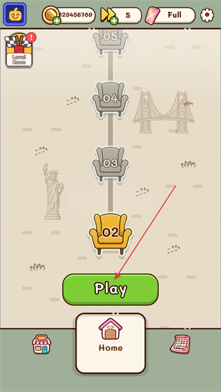1、這是關(guān)卡選擇界面,當(dāng)前可進入Level2,點擊界面中的Play按鈕,即可進入該關(guān)卡;界面上方還展示了當(dāng)前的資源信息。