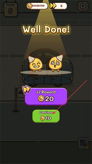 4、完成Level2關(guān)卡后,界面出現(xiàn)WellDone的完成提示,點擊Continue按鈕,即可領(lǐng)取對應(yīng)的獎勵并繼續(xù)后續(xù)的關(guān)卡流程。