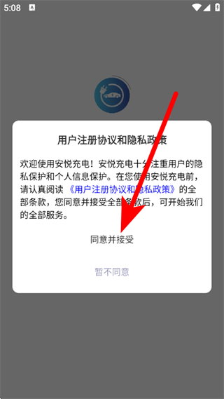 1、打開(kāi)安悅充電樁,在彈出提示框,點(diǎn)擊同意并接受,進(jìn)入首頁(yè)。