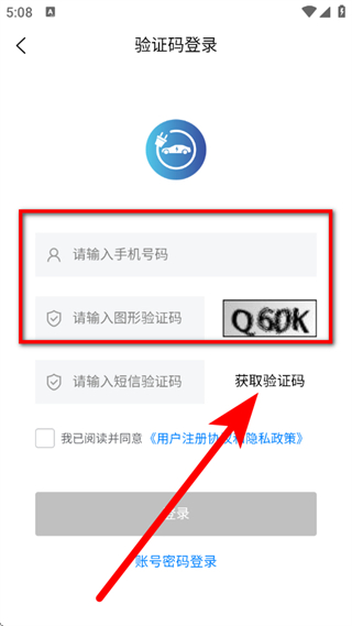 3、在驗(yàn)證碼登錄頁(yè)面,輸入手機(jī)號(hào)碼,點(diǎn)擊獲取驗(yàn)證碼。
