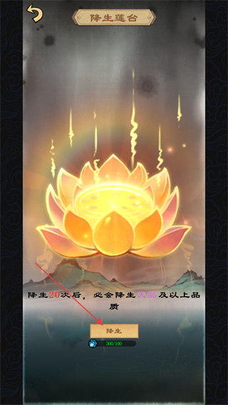 3、進(jìn)入降生蓮臺界面,消耗對應(yīng)資源點擊降生按鈕,須知降生20次后,必會降生天品及以上品質(zhì)來獲取高品質(zhì)產(chǎn)出。