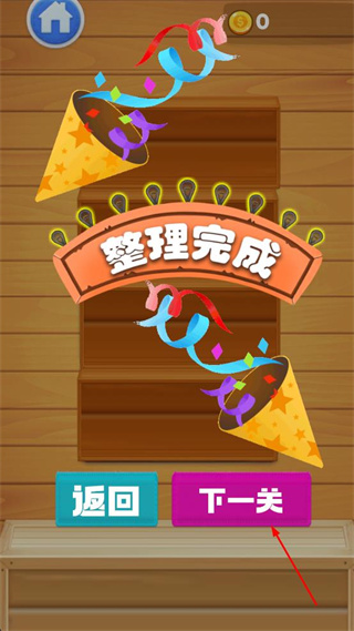 4、看到整理完成提示后,點(diǎn)擊紫色的下一關(guān)按鈕,進(jìn)入下一個(gè)整理關(guān)卡。