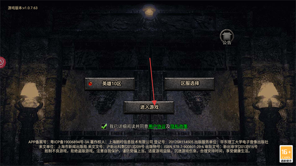 1、在游戲登錄界面,勾選我已詳細(xì)閱讀并同意用戶協(xié)議及隱私政策后,選定英雄10區(qū)點(diǎn)擊進(jìn)入游戲按鈕進(jìn)入游戲。