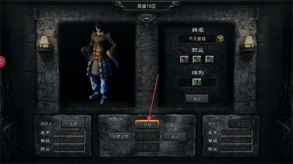 2、進(jìn)入英雄10區(qū)的角色界面,確認(rèn)姓名職業(yè)性別等信息后,點(diǎn)擊界面中的開始按鈕進(jìn)入游戲流程。