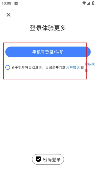 3、在登錄頁面,勾選協(xié)議后點擊手機號登錄按鈕,完成賬號登錄。