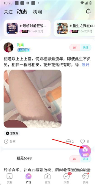 1、在首頁(yè)點(diǎn)擊底部的廣場(chǎng)選項(xiàng),進(jìn)入廣場(chǎng)動(dòng)態(tài)頁(yè)面。