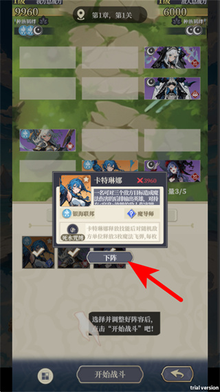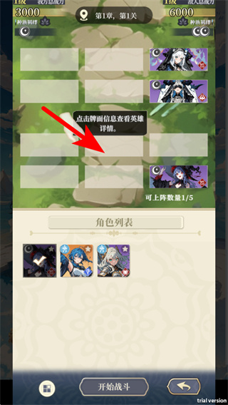1、進(jìn)入戰(zhàn)斗準(zhǔn)備界面后,點(diǎn)擊箭頭指引的角色牌面,這是查看英雄詳情的關(guān)鍵操作,點(diǎn)擊后即可了解角色信息。