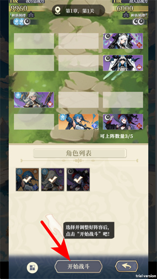 3、完成陣容調(diào)整后,點(diǎn)擊開(kāi)始戰(zhàn)斗按鈕,這是進(jìn)入關(guān)卡戰(zhàn)斗的核心操作,準(zhǔn)確點(diǎn)擊即可開(kāi)啟對(duì)戰(zhàn)流程。