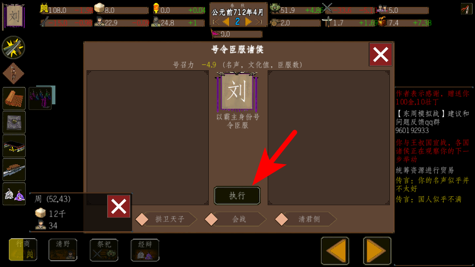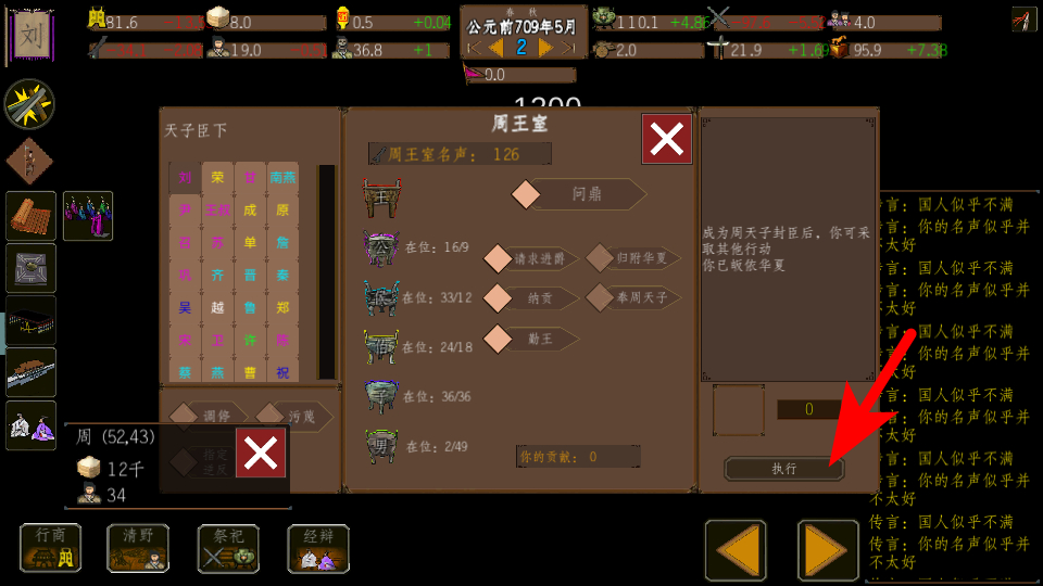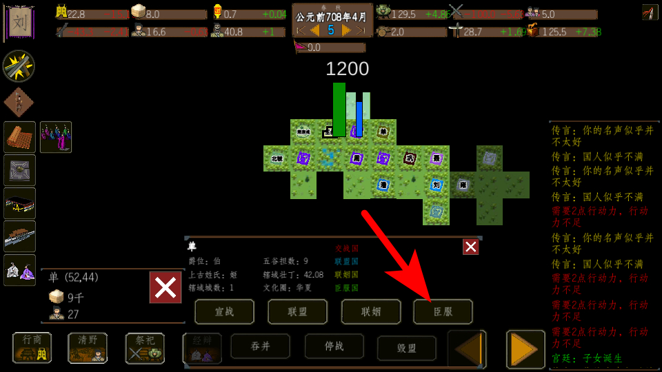4、點(diǎn)擊箭頭指向的功能選項(xiàng),這是達(dá)成諸侯臣服的必要操作,按指引操作即可完成對應(yīng)勢力互動(dòng)。
