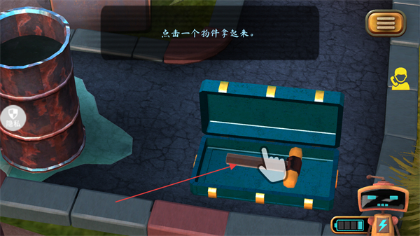 4、公文包翻轉(zhuǎn)后已打開,根據(jù)提示點擊一個物件拿起來,點擊包內(nèi)的物件如圖中的工具,完成拾取操作,獲取道具以推進后續(xù)游戲進程。