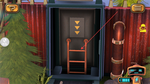 4、打開大門后,觀察界面中的梯子與帶有三個向上三角標識的區(qū)域,按標識提示完成交互操作以推進游戲流程。