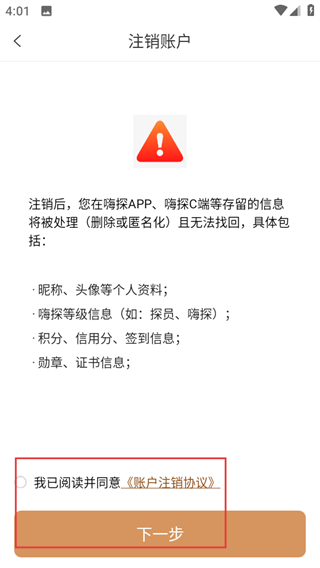 5、在注銷頁面,勾選協(xié)議后點(diǎn)擊下一步,進(jìn)入原因選擇頁面。