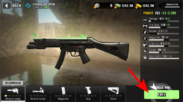 2、找到箭頭標(biāo)注的升級(jí)按鈕,點(diǎn)擊它強(qiáng)化當(dāng)前武器,這是提升戰(zhàn)斗能力的基礎(chǔ)操作,點(diǎn)擊后武器屬性會(huì)得到增強(qiáng)以應(yīng)對(duì)敵人。