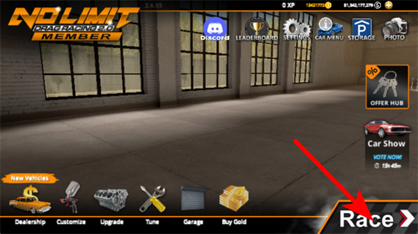 1、進(jìn)入游戲后,點(diǎn)擊箭頭指引的按鈕,這是進(jìn)入賽事界面的關(guān)鍵操作,點(diǎn)擊后即可查看可參與的賽車比賽。