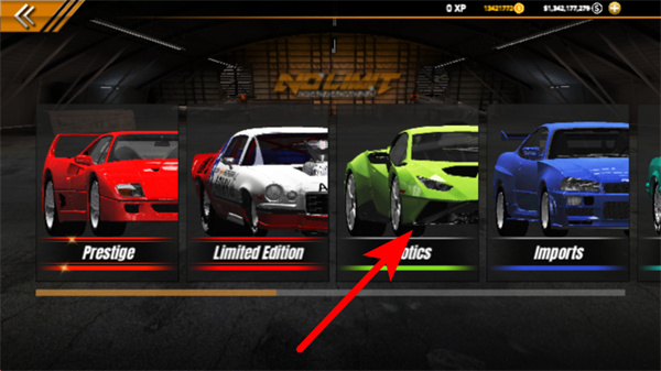 3、跟隨箭頭指引的方向,點(diǎn)擊對(duì)應(yīng)的車輛分類,這是切換賽車類型的核心操作,操作后可查看該分類下的可選車輛。