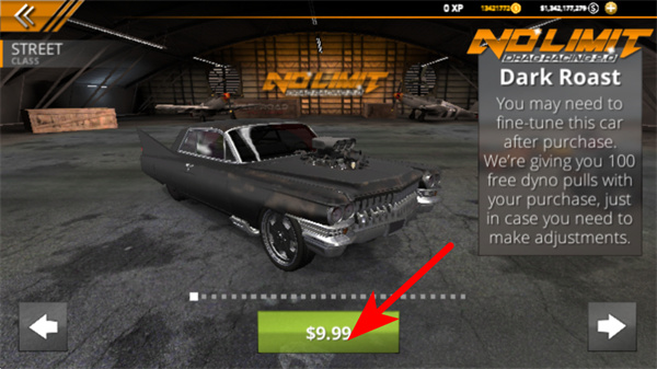 4、點(diǎn)擊箭頭指向的購(gòu)買按鈕,這是獲取目標(biāo)車輛的必要操作,點(diǎn)擊后即可消耗對(duì)應(yīng)資源解鎖該賽車用于后續(xù)比賽。
