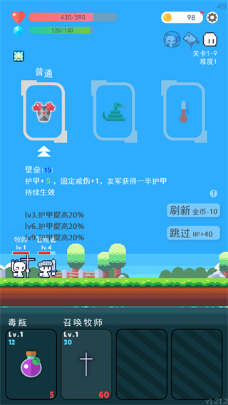 3、像素畫(huà)風(fēng)復(fù)古懷舊,完美契合肉鴿冒險(xiǎn)的玩法基調(diào),怪物與技能特效設(shè)計(jì)簡(jiǎn)潔卻不失張力,視覺(jué)體驗(yàn)舒適且有記憶點(diǎn)。
