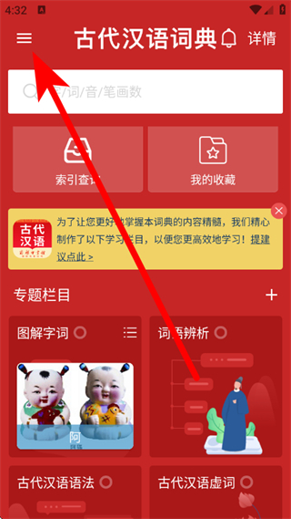 1、打開古代漢語詞典,點(diǎn)擊首頁左上角的橫線,進(jìn)入更多頁面。