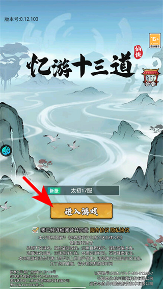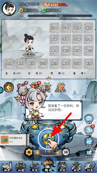 1、進入游戲后,點擊箭頭指引的按鈕,這是進入游戲主界面的關鍵操作,點擊后即可進入角色養(yǎng)成的核心場景。