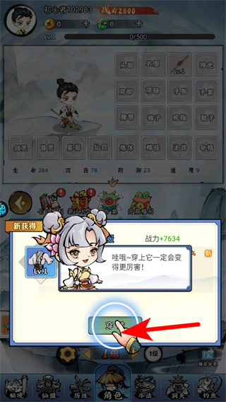 3、跟隨箭頭指引的方向,點擊對應的穿戴按鈕,這是裝備新道具的核心操作,操作后角色會換上該裝備并提升屬性。