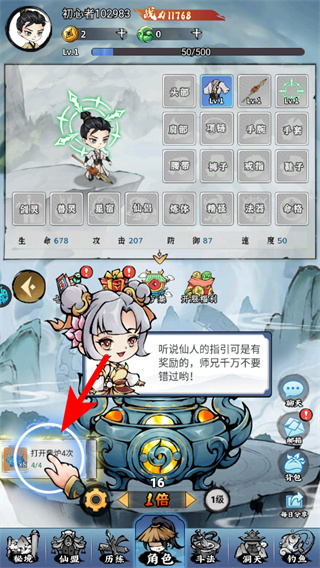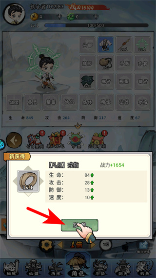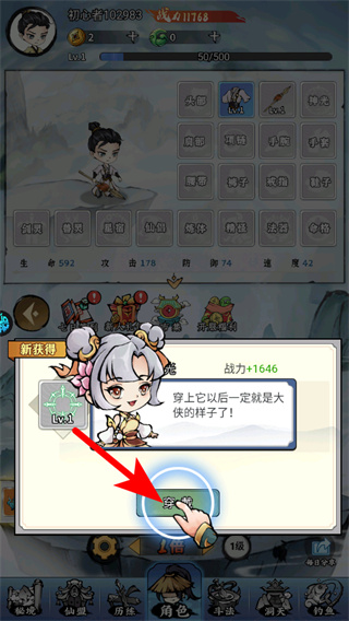 1、進(jìn)入游戲后,點(diǎn)擊箭頭指引的按鈕,這是穿戴新裝備的關(guān)鍵操作,點(diǎn)擊后角色會換上該道具并提升對應(yīng)屬性。
