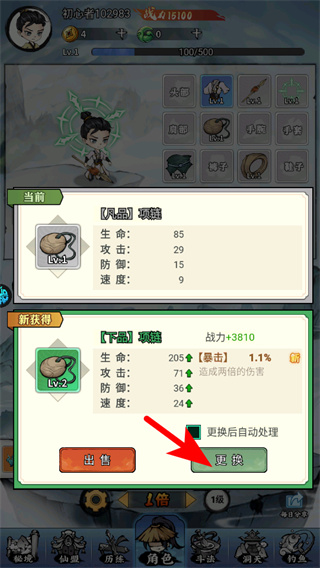 4、點(diǎn)擊箭頭指向的更換按鈕,這是替換裝備的必要操作,操作后會將當(dāng)前裝備替換為屬性更優(yōu)的新道具。
