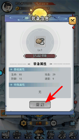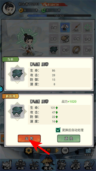 1、進(jìn)入游戲后,點(diǎn)擊箭頭指引的出售按鈕,這是處理閑置裝備的關(guān)鍵操作,點(diǎn)擊后可將舊腰帶出售以獲取資源。