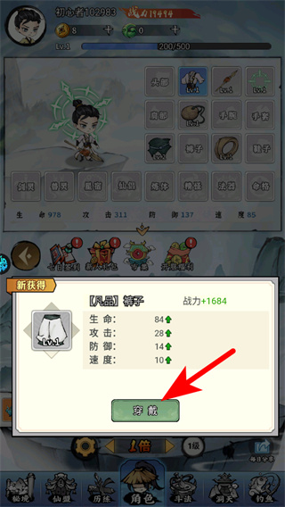 3、跟隨箭頭指引的方向,點(diǎn)擊對(duì)應(yīng)的穿戴的按鈕,這是裝備新褲子的核心操作,操作后角色會(huì)換上該道具并增強(qiáng)對(duì)應(yīng)屬性。