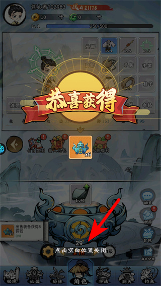 4、點(diǎn)擊箭頭指向的空白區(qū)域,這是關(guān)閉獎(jiǎng)勵(lì)彈窗的必要操作,操作后即可回到主界面繼續(xù)進(jìn)行裝備養(yǎng)成流程。