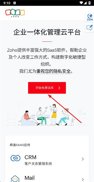 2、在企業(yè)一體化管理云平臺頁面點擊開始免費試用按鈕,進入注冊頁面。