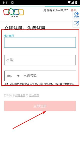 3、在注冊頁面填寫電子郵箱、密碼、電話號碼并勾選協(xié)議后,點擊立即注冊按鈕完成注冊。