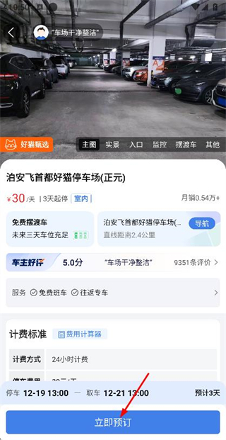 3、在停車場(chǎng)詳情頁面點(diǎn)擊立即預(yù)訂按鈕,完成該停車場(chǎng)的預(yù)訂流程。