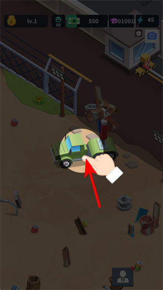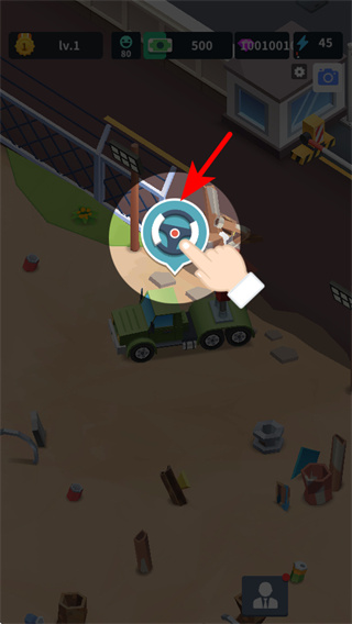2、進(jìn)入場景后,點(diǎn)擊紅色箭頭指向的車輛區(qū)域,選中收集廢料的卡車,為后續(xù)操作做準(zhǔn)備。