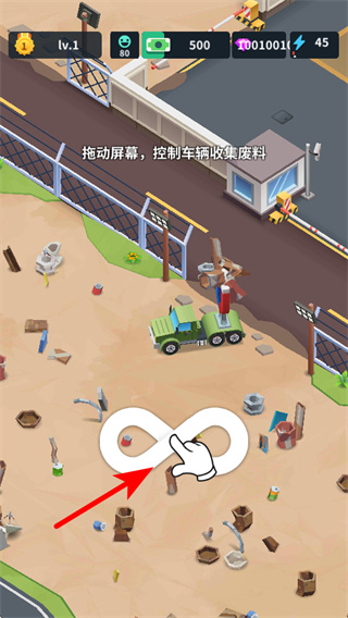 4、按照提示拖動屏幕沿紅色箭頭指引的方向,控制車輛移動,收集場景中的廢料資源,推進(jìn)鋼鐵廠的經(jīng)營進(jìn)度。